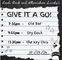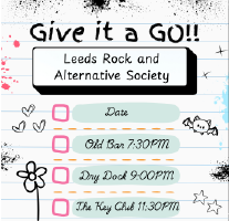 This post was created to advertise the Give it a Go event the society put on at the start of the academic year. The event had the purpose of introducing new people to the society so they could decide if they wanted to join. I had to put the correct dates and times onto the post to ensure the information was as accurate as possible so that new members could find us easily and avoid any confusion. When I began designing for this post I decided to take inspiration from phrases such as "Keep it in your calendar" by using hand-drawn typography in a notebook, as if someone is writing down the dates of an event. I did this to emphasise how people didn't want to miss the event and that it was a date worth saving. After this, I added hand-drawn graphics to the post to appear like a person is doodling in a notebook to add to the alternative style of the society. I continued with the usual black and white colour palette of the society and ensured that the typography "Leeds Rock and Alternative Society" appeared on the post to ensure audiences knew of the society.