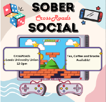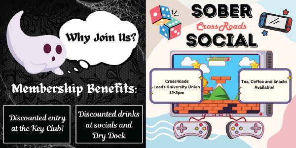 This post had the purpose of informing our members about an event called the "Sober Social", in which our members would come together to play board/video games, have coffee or tea and socialise without the presence of alcohol. The key point of the event is ensuring that members are aware that alcohol and clubbing are not a requirement of the society and allow those uncomfortable around alcohol to also feel safe and supported. I was given a brief to make the post appear cosy and welcoming, meaning I decided to deviate from the usual black and white colour scheme of the society in favour of brighter pastel colours that better fit the post. I decided to make use of both bold and cursive fonts to make the design look textually interesting and made use of colourful graphics to help the post become more eye-catching. By using video games as the main graphic choice, I was able to represent the quieter atmosphere of the Sober Social over other events hosted by the society and am able to represent the vast amount of ways the society helps others to feel happy and welcomed.