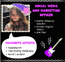This post is part of a series of posts I designed for the society to introduce the new 2024-2025 committee that I am also a part of. This was done to humanise us and represent ourselves as real people to those considering joining, and so we can be identified easily by those who have never met us before and don't know who to socialise with. There were four key things I wanted to include in these posts: a photo of ourselves so people can see who we are, our role in the society, and other important information about ourselves and some information about our top three bands so that people have a topic they are able to discuss with us if they have never interacted with the society before. I decided to put the music section of the post in a speech bubble to represent our own thoughts and opinions about rock and alternative music to further represent us as real people. I made use of fun and colourful graphics that I believed fit the personalities of each member such as the shooting star that can be seen on my own post. I also ensured that each individual post had a guitar on it to emphasize that we are part of the rock music society to showcase a common interest among the committee. Furthermore, I made each post have a different colour scheme to make them all individually stand out. Because of the nature of our society, each post contained the member's pronouns to showcase that we are a welcoming community and to showcase us as an approachable safe space for people to join.