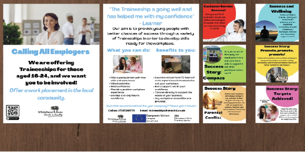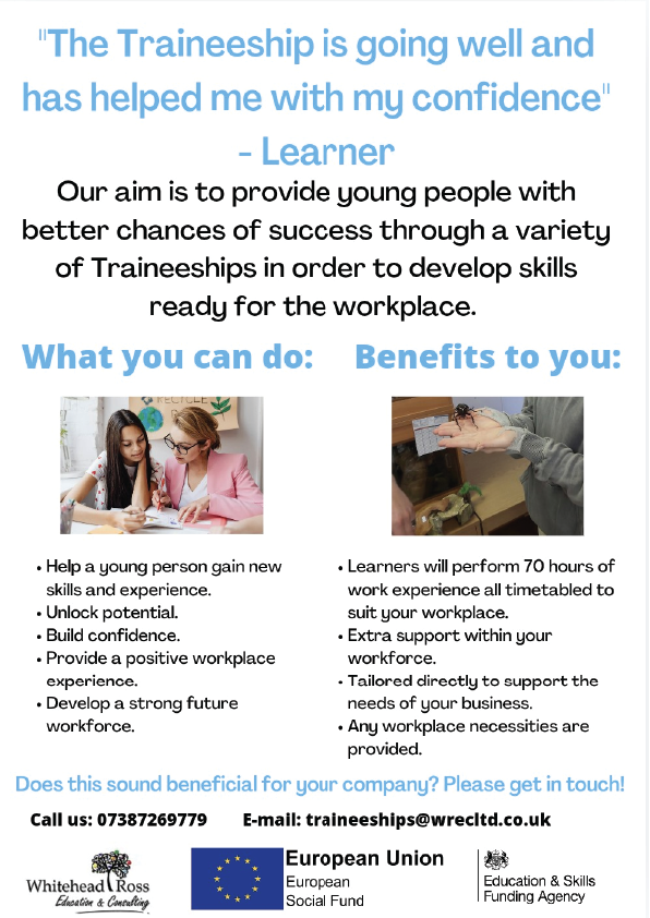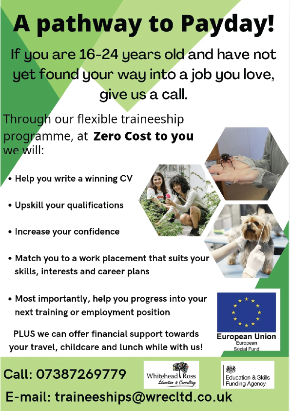 When creating the flyers targeting learners, I still used formal language to showcase how the company was serious about their needs. I made sure to outline all the help and experience they would gain by choosing to sign up to WhiteHead Ross including their finances being covered, help writing their CVs and the help they would receive going into employment. By doing this I was able to make it clear what the company did and all the benefits that people would receive by signing up. I also made sure, as I did on all products made during this work experience, that the correct logos were showcased on the flyers to show the certification that the company was following government and European laws. I included the slogan "Pathway to Payday" to make the flyer more memorable to those reading it and used the colour green to try and associate the flyer with positivity as it is often associated with growth and harmony. Again, the flyer was finished by adding the company contact details to allow any possible learners to easily sign up for the programme.