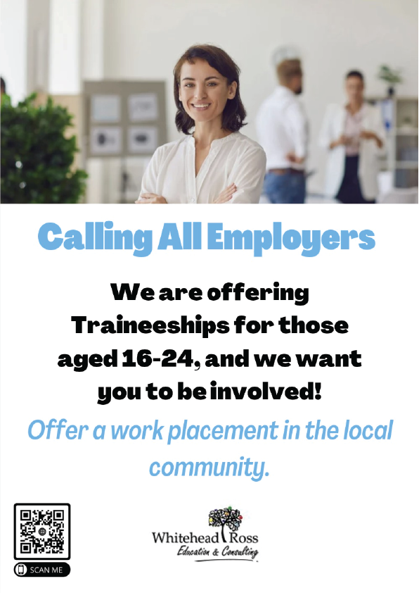 One of the main things I created during my work experience was flyers advertising the business to potential learners and businesses. While designing them I had to learn to use different words and phrases between them due to the different audiences being targeted. When advertising at businesses I wanted to showcase the good their cooperation with WhiteHead Ross would be as they would be giving a work placement to a young person in need of experience and who needs help to start their career. I used the colours blue and white to create a formal appearance, with bold fonts being used to immediately showcase what was being advertised. I made sure to include the positive comments from learners who had completed a course with Whitehead Ross to emphasize the positives of giving young people the chance to undergo a work placement. I ensured to showcase the positives a partnership could give the company as well, emphasising the extra support they would gain in the workplace and how they wouldn’t have to cover the costs of any learner they decided to employ. I finished the designs with the contacts they needed if they wanted to employ a learner. My designs later were used by the company to promote their business.